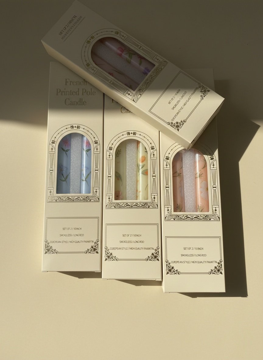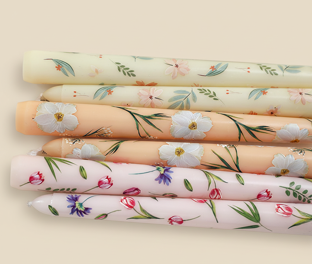 These beautifully crafted decorative candles feature a soft pastel base adorned with delicate floral illustrations, creating a romantic and timeless aesthetic. Designed to add warmth and sophistication to any interior, they are perfect for table styling, special occasions, or refined home décor.