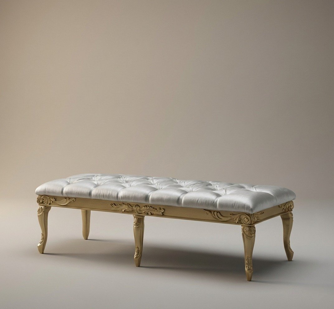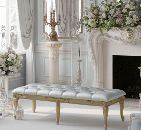 An elegant classic-style bench featuring a soft Tiffany-colored tufted upholstered seat, offering a refined and luxurious look. The bench rests on beautifully carved wooden legs finished in a rich gold tone, adding a regal charm to any interior. Ideal for living rooms, bedrooms, entryways, or at the foot of a bed, this piece combines timeless elegance with comfort and high-quality craftsmanship.